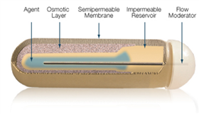 ALZET® Osmotic Pumps 是體積只有膠囊大小的滲透壓泵,符合 USP 醫(yī)療塑料膠材料生物相容性標(biāo)準(zhǔn),可植入實(shí)驗(yàn)動(dòng)物皮下或腹腔內(nèi),直接或通過導(dǎo)管以 ul/小時(shí)的速度緩慢持續(xù)準(zhǔn)確地送出測試藥劑。Alzet 緩釋泵由外到內(nèi)分為三層(如下圖所示),最外層是半透膜材料(Semipermeable Membrane),最內(nèi)層為不透水彈性材料制成的貯藥囊(Impermeable Reservoir),中間為高滲的鹽夾層(Osmotic Layer)。當(dāng)泵體被植入動(dòng)物體內(nèi)時(shí),由于滲透壓差迫使體液透過泵表面的半透膜流向高滲鹽夾層,擠壓貯藥囊,使藥物(Agent)按照預(yù)計(jì)速度經(jīng)導(dǎo)流管(Flow Moderator)釋放到動(dòng)物體內(nèi)。