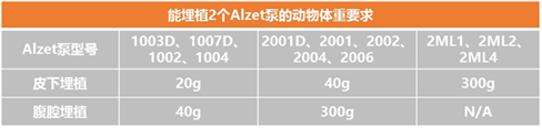 埋植多個(gè)Alzet泵必須確保動(dòng)物體重足夠大,能容納多個(gè)泵的大小和重量。下表總結(jié)了埋植2個(gè)指定型號(hào)給藥泵時(shí)動(dòng)物需要滿足的最小體重。