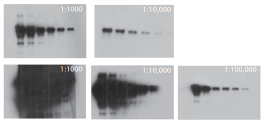 該產(chǎn)品是基于魯米諾開發(fā)的一種非同位素的HRP底物,當(dāng)有H2O2存在時,HRP可催化魯米諾發(fā)光,且這個反應(yīng)相當(dāng)迅速。該底物檢測信號與被檢蛋白濃度呈非常好的正相關(guān)關(guān)系,靈敏度高達(dá)pg級別。此外,反應(yīng)物可從膜上洗去,然后重新加入底物反應(yīng),如此進(jìn)行實(shí)驗(yàn)結(jié)果的優(yōu)化而不再需要重復(fù)全部WB過程。LumiGLO Reserve是對LumiGLO的第二代升級產(chǎn)品,可檢測pg-fg級(HRP g/ml)