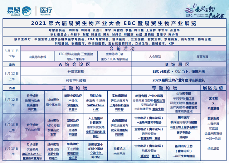 2021第六屆易貿(mào)生物產(chǎn)業(yè)大會(huì)EBC將于3月11-13日在蘇州國(guó)際博覽中心隆重召開(kāi)。EBC 2020年參會(huì)人數(shù)2724人,2021年將突破4000人規(guī)模,參會(huì)人群覆蓋創(chuàng)業(yè)者、科學(xué)家、臨床醫(yī)生、投資人和供應(yīng)商等。同期開(kāi)展的易貿(mào)生物產(chǎn)業(yè)展覽,將有超過(guò)200家儀器、耗材、服務(wù)等供應(yīng)商展出,會(huì)+展聯(lián)動(dòng)的EBC,已成為國(guó)內(nèi)外生物產(chǎn)業(yè)高層交流與合作的標(biāo)桿平臺(tái)。