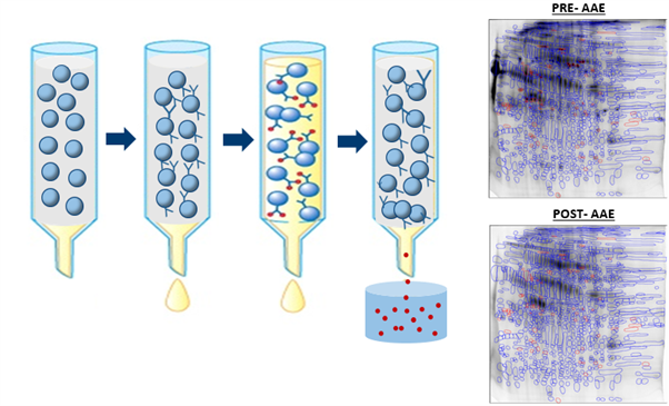 現(xiàn)階段,常用的HCP抗體覆蓋率驗(yàn)證的方法都存在其自身的局限性。AAE方法解決了傳統(tǒng)2DWB中的低靈敏度和低特異性的問題。而且,由于AAE可以在富集本身含量較低的HCP的同時,還可以大幅降低中間品和終產(chǎn)品中的藥物蛋白。這使對中間品和終產(chǎn)品中HCP與HCP抗體的反應(yīng)情況的分析成為可能。盡管如此,AAE和銀染分析也不能具體得知樣品中具體有哪些種類的HCP,尤其是那些與人體有較高免疫原性和對藥物有較大影響的HCP?;谝陨蠁栴}的考慮,Cygnus利用更精準(zhǔn)的質(zhì)譜檢測方法與AAE相結(jié)合,推出了新一代的AAE和Mass Spectrum覆蓋率驗(yàn)證服務(wù)。