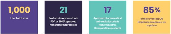 英國Astrea Bioseparations于1987年成立,公司前身是Affinity Chromoatography Ltd,其從英國劍橋大學(xué)獨(dú)立出來專注于吸附填料的研發(fā)和生產(chǎn)。Astrea Bioseparations 公司兩大核心專利技術(shù)(產(chǎn)品)Mimetic ligand® 和PuraBead® 是公司產(chǎn)品的基石,迄今為止已有21個(gè)上市產(chǎn)品(FDA/EMA) 使用 Astrea Bioseparations公司的產(chǎn)品用于商業(yè)化生產(chǎn),其中不乏跨國公司和新興生物技術(shù)公司。