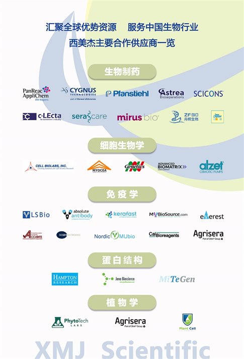 北京西美杰科技有限公司(Beijing XMJ Scientific Co.,Ltd,以下簡稱西美杰)于2006年由留美歸國生物領(lǐng)域?qū)I(yè)人才創(chuàng)辦,是一家集進(jìn)口試劑銷售、技術(shù)服務(wù)與合約開發(fā)于一體的高科技公司,旨在為生命科學(xué)發(fā)展提供一流的產(chǎn)品與服務(wù)。