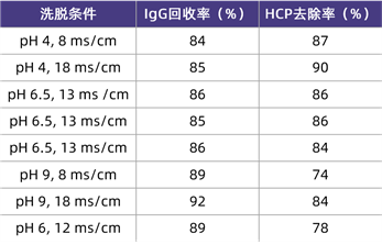 在該應(yīng)用案例中,研究人員使用CHO細胞表達IgG型單克隆抗體,澄清后的收獲液先經(jīng)過Protein A親和層析純化,洗脫液經(jīng)中和后調(diào)節(jié)成不同的pH(4.0-9.0)和電導(dǎo)率(8-18ms/cm),再以流穿模式上樣到HCPureTM中,收集流穿液和淋洗液,檢測IgG和HCP含量,其中,pH 6.0、電導(dǎo)率12ms/cm是未經(jīng)調(diào)節(jié)的親和層析洗脫中和液。