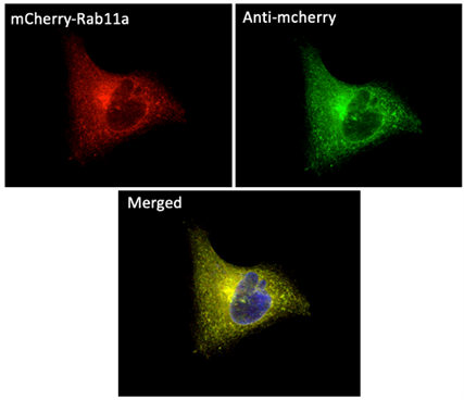 MCR細胞轉(zhuǎn)染表達mCherry-Rab11a后用甲醇固定并用1/250稀釋的anti-Rab11a抗體和anti-mCherry抗體做免疫熒光結(jié)果