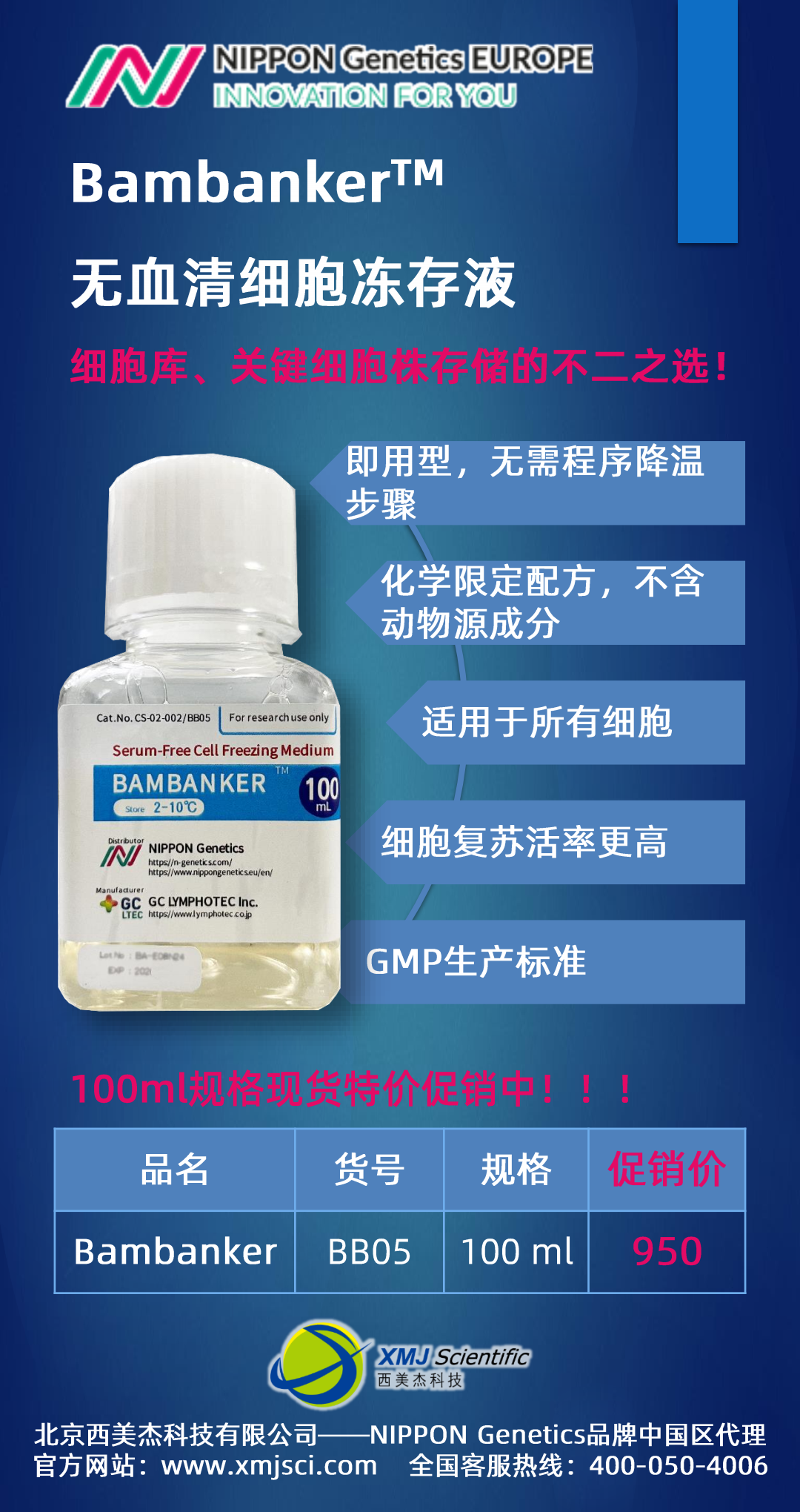 Bambanker?無(wú)血清細(xì)胞凍存液現(xiàn)貨促銷(xiāo)100ml特價(jià)950元