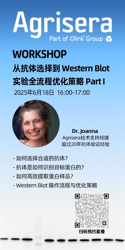 Western Blot實(shí)驗(yàn)效率與結(jié)果的可靠性,很大程度上取決于對(duì)抗體特性的理解、正確的選擇以及實(shí)驗(yàn)流程的優(yōu)化。為解決WB實(shí)驗(yàn)過程中的常見問題,Agrisera技術(shù)專家Joanna博士將為大家?guī)?/span>WB全流程優(yōu)化系列講座,本系列講座包含兩次線上直播課程,6月18日下午4點(diǎn)直播第一次課程:從抗體選擇到WB全流程優(yōu)化策略,深度解析Western Blot技術(shù)的關(guān)鍵環(huán)節(jié),為您提供專業(yè)的優(yōu)化方案,歡迎大家提前報(bào)名預(yù)約。