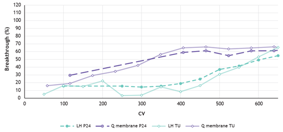 下圖是VSV-G LVV樣品在不同流速下通過(guò)LentiHERO(LH)與Q膜流穿液的TU和p24檢測(cè)結(jié)果,LentiHERO對(duì)LVV的結(jié)合能力顯著高于Q膜。由此表明,LeniHERO在LVV流穿之前能夠處理更大體積的料液。